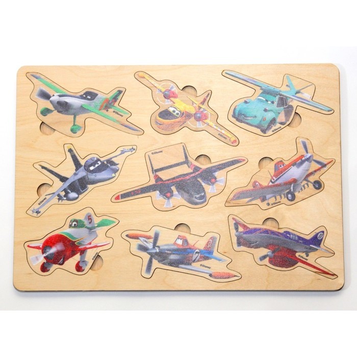 Пазл деревянный «Самолёты» с героями одноимённого мультфильма Disney. Состав: игровой планшет с углублениями под пазлы-фигурки (30 х 21 см), фигурки с изображениями героев мультфильма (9 шт.). Игровое поле имеет специальные пазы – углубления для детских пальчиков, с помощью которых удобно доставать фигурки из лунок. Игра изготовлена из берёзовой фанеры. Поле имеет скругленные углы, поверхность тщательно отшлифована. Изображения нанесены с помощью печати по дереву. Игра развивает мелкую моторику рук, щипковый захват и логику.