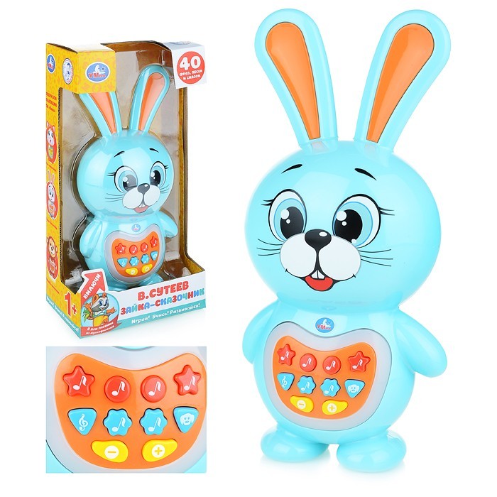Развивающая игрушка «Зайка-сказочник» ТМ «УМка» порадует малыша своими интересными функциями.Функции:- 10 песен из м/ф («АБВГДейка», «Весёлая карусель», «Кручу педали», «Облака», «Песенки друзей», «Песенка Львёнка и Черепахи», «Песенка Мамонтёнка», «По дороге с облаками», «Улыбка», «Чунга-Чанга»)- 6 сказок В. Сутеева («Мешок яблок», «Под грибами», «Палочка-выручалочка», «Зайкин кораблик», «Яблоко», «Три котёнка»)- 20 интересных фактов о животных- 5 фраз зайки- световые эффектыМилый зайка станет добрым другом для малыша. Зайка-сказочник знает 40 фраз, песен и сказок. С ним малышу точно не будет скучно. Компактный размер игрушки позволяет ребёнку брать её везде с собой.С игрушкой ТМ «УМка» малыш будет развивать:- память- музыкальный слух- тактильные навыки- мелкую моторику- визуальное восприятие- моторику- координацию движенийРазмер игрушки: 10 х 23,5 х 5 см.Материал: пластмасса+металл.Укомплектовано 3 батарейками типа АА.Рекомендовано для детей от 1 года.
