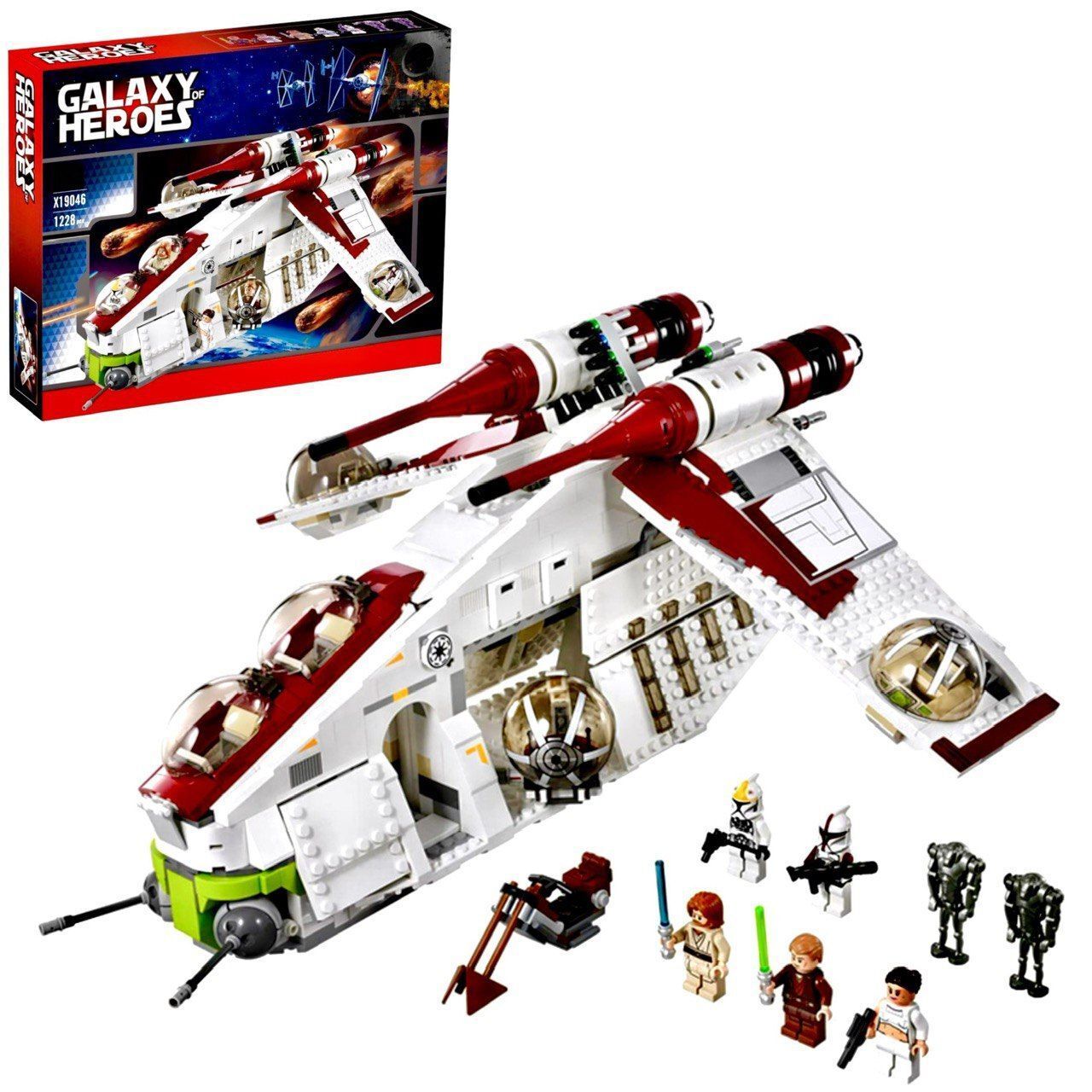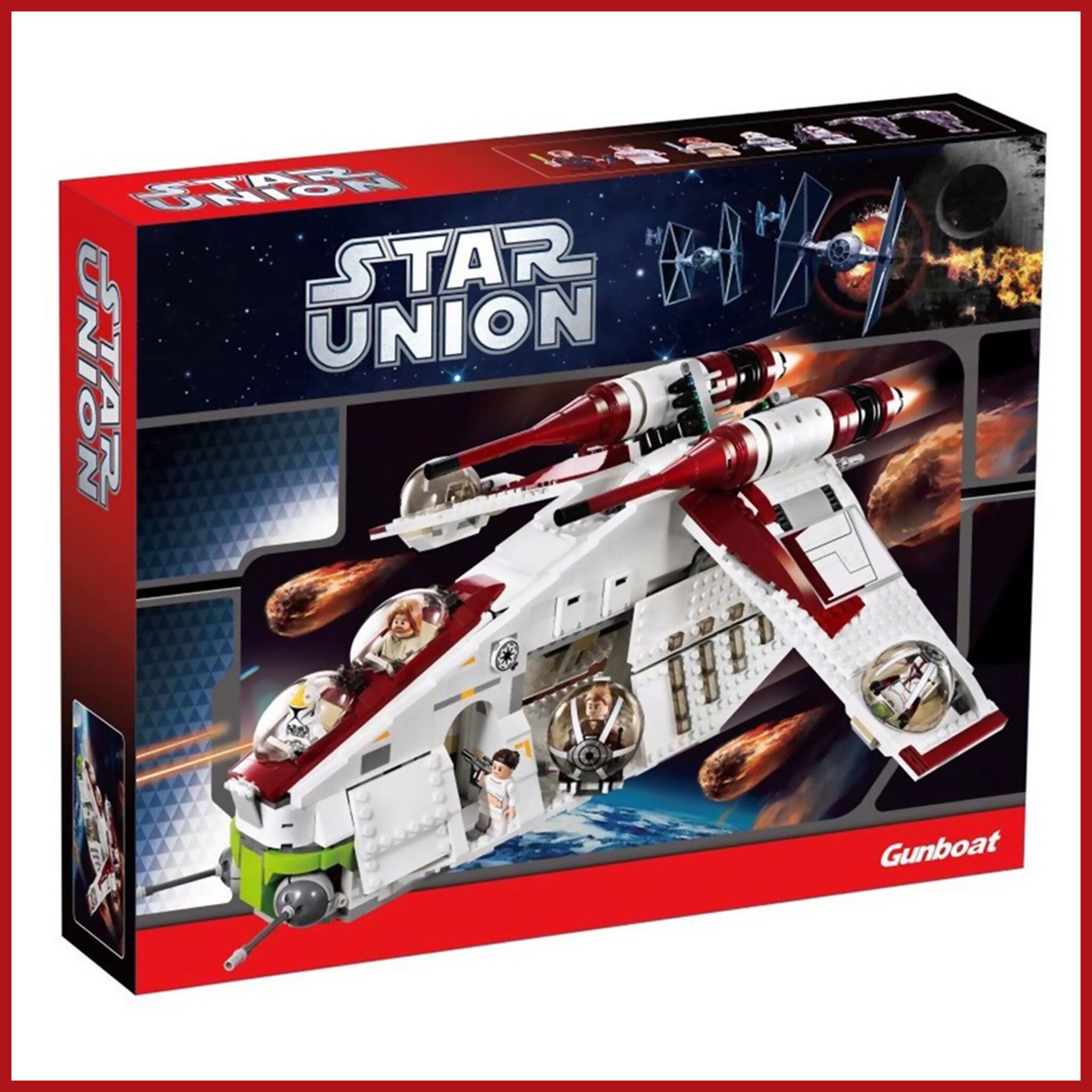 Отправляйся на Джеонозис на крутом Республиканском истребителе из серии KING Star Wars на помощь Оби-Вану Кеноби, Энакину Скайуокеру и Падме Амидала, пока их не одолели 2 супербоевых дроида! Нацель 4 шаровых пушечных турели с кабиной для минифигурки, затем открой передний отсек, чтобы взять маневренные ракеты и зарядить ими 8 пусковых установок, смонтированных сверху! Открой боковые и задние двери, чтобы развернуть пикирующий байк! Используй подъёмную рукоятку для упрощения пилотирования!