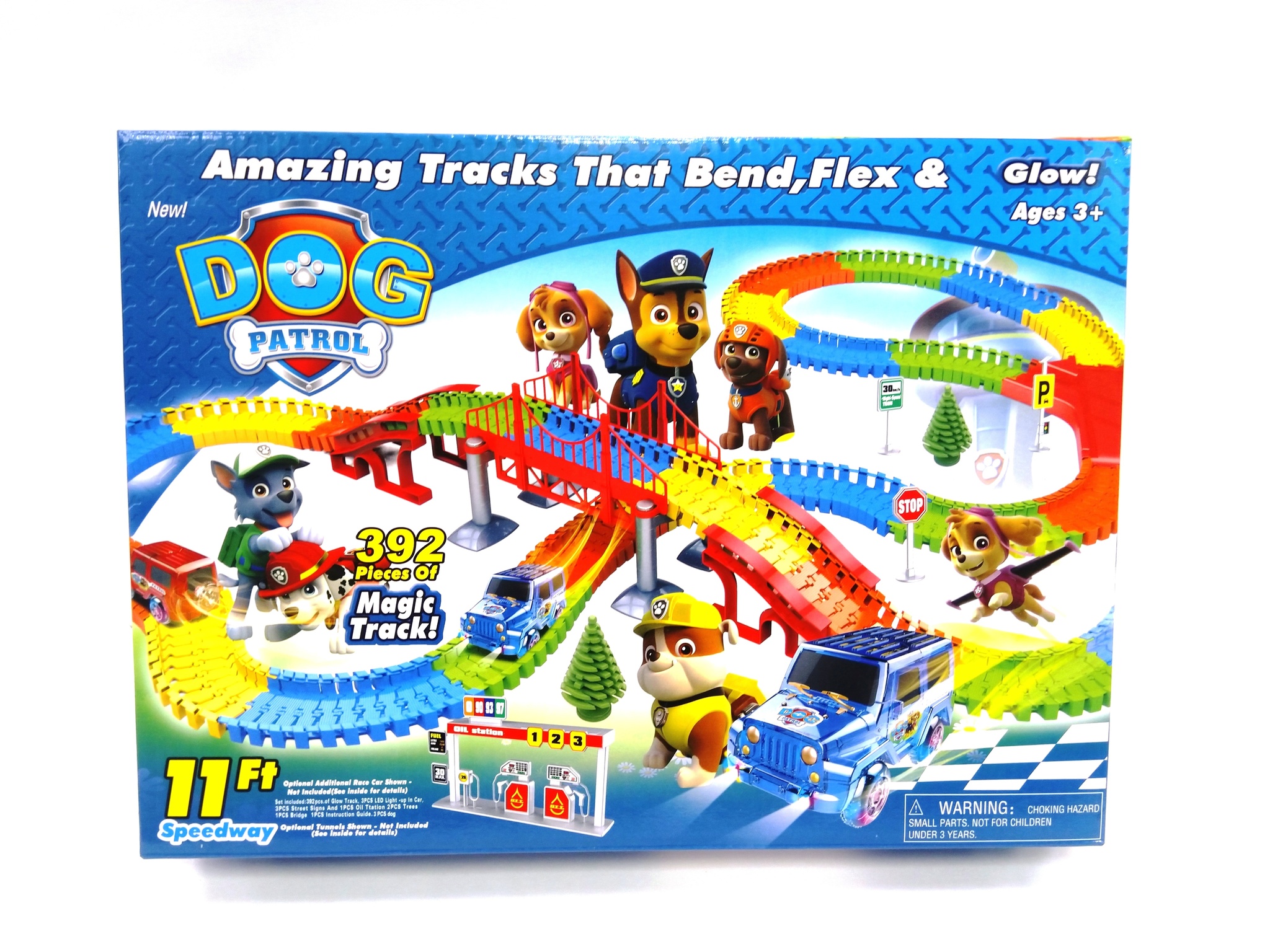 Magic Tracks - это большая круговая трасса, по которой ездит машинка со светящимися фарами. Машинка стремительно мчится вперед, огибая множество различных преград и резких поворотов. Просто соедините его части так, чтобы получить круговые повороты и крутые виражи, трек можно конструировать на свое усмотрение. Машинка работает от 2 батареек типа АА (в комплект не входят). Дизайн упаковки может незначительно отличаться по решению производителя. Так же в набор входят 3 собачки .