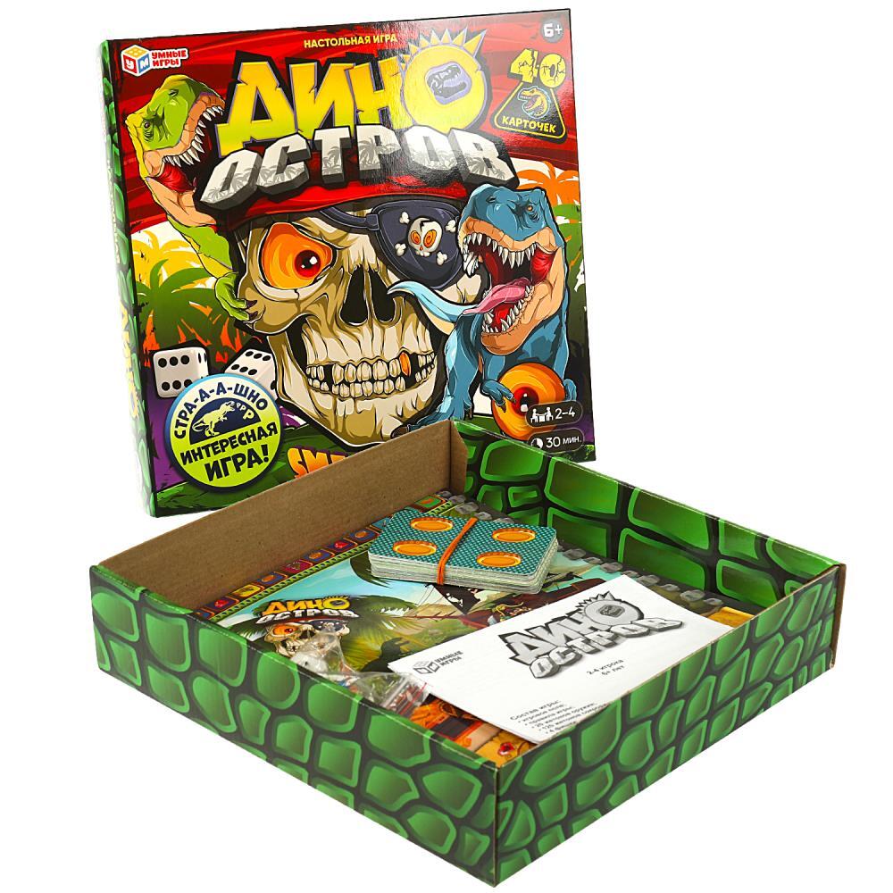 Настольная игра-ходилка «Дино остров» ТМ «Умные игры» - страшно интересная игра для небольшой компании.Особенности:- красочный дизайн- количество игроков: 2-4- продолжительность игры: от 30 минутСостав игры:- игровое поле- 8 жетонов аптечек- 20 жетонов оружия- 120 жетонов сокровищ- 4 фишки и 1 игровой кубик - правила игрыЗавладейте сокровищами острова! Юные пираты, вы готовы отправиться на поиски сокровищ? Посетите таинственный остров, полный опасностей. Первым найдите все сокровища, которые он скрывает. Будьте осторожны: на острове живут опасные динозавры, и они не позволят вам так просто завладеть драгоценностями. Но не унывайте, ведь с вами ваша сабля и мушкет! Йо-хо-хо, вперёд на поиски сокровищ!ЦЕЛЬ ИГРЫПервым соберите на своём участке игрового поля все сокровища острова, хотя бы по одному экземпляру каждого предмета.ПОДГОТОВКА К ИГРЕРазрежьте карточки с жетонами по пунктирной линии. Разделите карточки на стопки по картинкам: в каждой стопке должны быть карточки только одного вида. Выложите жетоны отдельными стопками рядом с игровым полем.Каждый игрок выбирает себе фишку и участок игрового поля, который он будет заполнять жетонами сокровищ. Все игроки ставят свои фишки на клетку «Старт».Чтобы определить очерёдность хода, игроки по очереди бросают кубик. Первым ходит тот игрок, у которого выпало наибольшее количество очков. Далее ход передаётся по часовой стрелке.ХОД ИГРЫВ свой ход игрок бросает кубик и передвигает фишку вперёд по дорожке на выпавшее количество клеток. В зависимости от клетки, на которой остановилась фишка, игрок выполняет действия из инструкции.Если игрок прошёл по игровой дорожке полный круг, а игра ещё не закончилась, он начинает движение по новому кругу.ЖЕТОНЫ СОКРОВИЩДля победы в игре вам необходимо собрать как минимум по одному жетону каждого сокровища.— Дублон— Рубин— Золотой слиток— Алмаз— Кольцо— Яйцо динозавра. Трицератопс и велоцираптор слишком заняты пропажей и не станут нападать на вас. Если вы обменяли в процессе игры ваши жетоны сокровищ на яйцо динозавра, вы больше не потеряете дублоны, рубины и золотые слитки до конца игры.— Статуэтка динозавра. Тираннозавр не станет нападать на вас, если у вас есть его точная копия из золота. Если вы обменяли в процессе игры ваши жетоны сокровищ на статуэтку динозавра, вы больше не потеряете алмазы и кольца до конца игры.Воспользуйтесь схемой, чтобы верно расположить жетоны сокровищ на своём участке поля.ОБМЕН ЖЕТОНОВ СОКРОВИЩОбратите внимание, что не все жетоны сокровищ можно получить, проходя по дорожке на поле игры. Алмаз, кольцо, яйцо динозавра и статуэтку динозавра можно получить, только обменяв на них другие жетоны сокровищ. Для обмена воспользуйтесь подсказкой на игровом поле. В свой ход можно обменять несколько жетонов.ЗАВЕРШЕНИЕ ИГРЫИгра заканчивается, когда один из игроков соберёт все виды жетонов сокровищ на своём участке поля. Он объявляется победителем.Настольная игра ТМ «Умные игры» развивает:- логику- стратегическое и пространственное мышление- социально-коммуникативные навыкиРазмер упаковки: 250 х 250 х 55 мм. Материал: пластмасса + картон.Рекомендованный возраст: 6+.