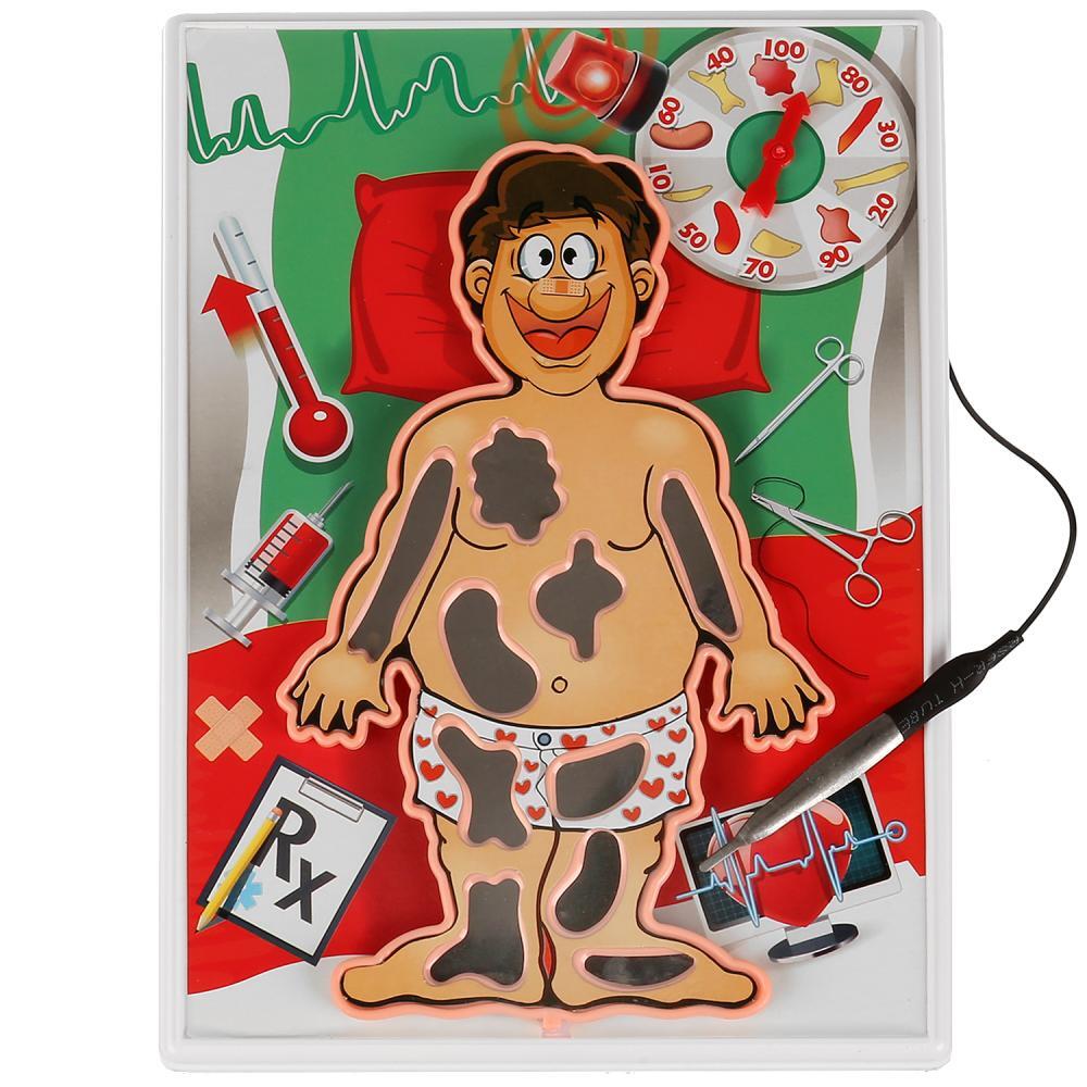 "Спокойно, больной!" это весёлая настольная игра, которая не даст скучать Вашим детям и позволит отлично провести время! Это своеобразный тренажёр для развития мелкой моторики рук, координации движений, глазомера и ловкости. Игра может использоваться как в домашних условиях, так и в детских учреждениях. Комплект состоит из игрового поля - операционного стола, фигурки пациента, пинцета и 10 формочек с наклейками, имитирующими части тела. Игра позволяет детям почувствовать себя настоящими врачами, даёт возможность провести "операцию". Элементы набора изготовлены из металла и высококачественного прочного пластика, окрашенного устойчивыми яркими красителями. Работает от 2 батареек типа АА (не входят в комплект). Игра предназначена для 2-4 человек. Рекомендовано детям старше 3-х лет.