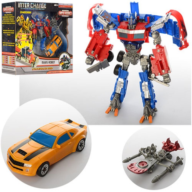 Набор трансформеров "Оптимус + Бамблби". 2 трансформера в одном наборе: большой Оптимус прайм (трансформируется из робота в грузовой автомобиль Peterbilt 379) и маленький Бамблби (трансформируется из робота в автомобиль Chevrolet Camaro).